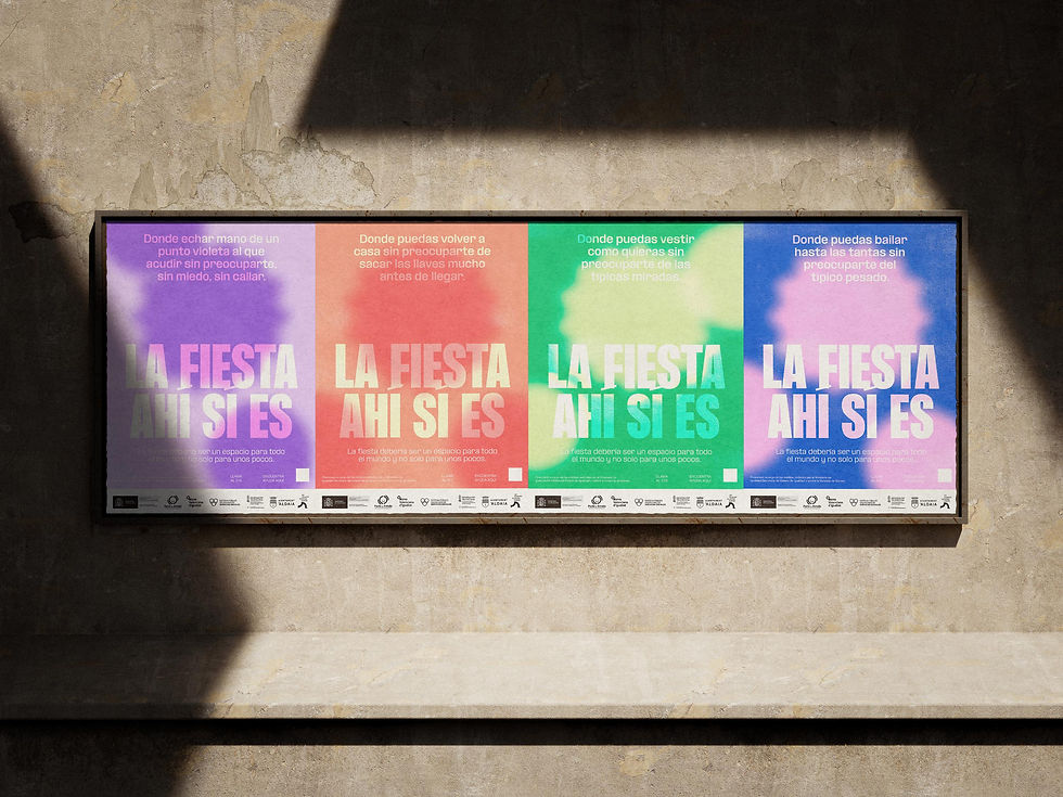 Acompaña a lo copys una identidad visual que nos recuerda a esas luces de discoteca en la que pasar momentos donde la fiesta debería ser un espacio seguro para todas y para todos, no solo para unos pocos.
